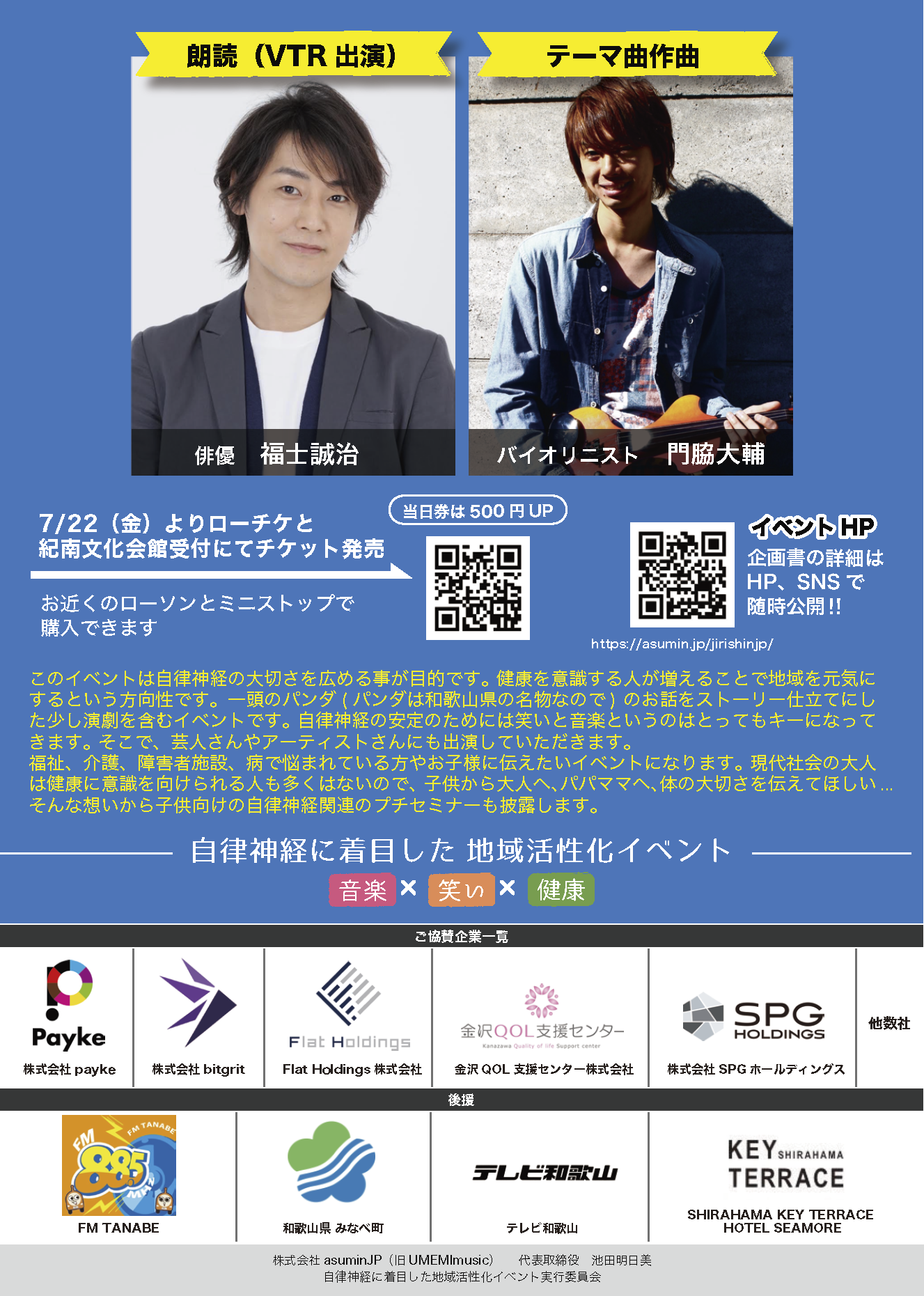 自律神経に着目した地域活性化イベント「じりしんjp」 コロナ禍で疲れた心と身体をリフレッシュしてもらうため、また自律神経の大切さを和歌山県に広め、健康な人が増えることで地域活性に繋げたいという思いを描き、和歌山県日高郡みなべ町出身の自律神経専門治療家ASUMIN.jpが主催・企画したじりしん(じりしんjp)をお届けします。 【チケットは紀南文化会館でも購入可能です】 紀南文化会館 〒646-0033 和歌山県田辺市新屋敷町1番地 TEL:0739-25-3033 FAX:0739-26-3220 受付時間:9:00~19:00 開館時間:9:00~21:30 休館日:水曜日(祝日は開館)、年末年始(12月29日~1月3日) イベント内容 出演者一覧 ご協賛企業・後援一覧